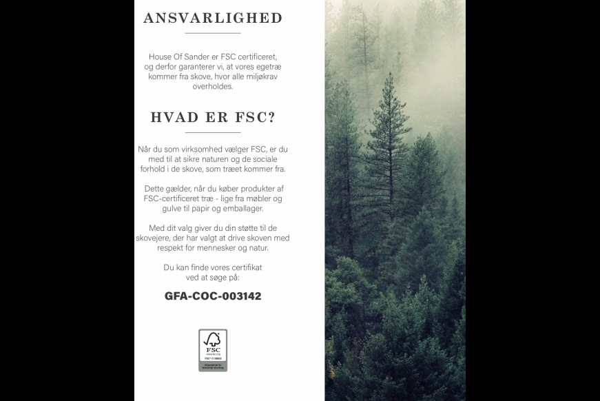 Bordet er lavet af FSC træ, som betyder at træet med garanti kommer fra et bæredygtigt skovbrug.
